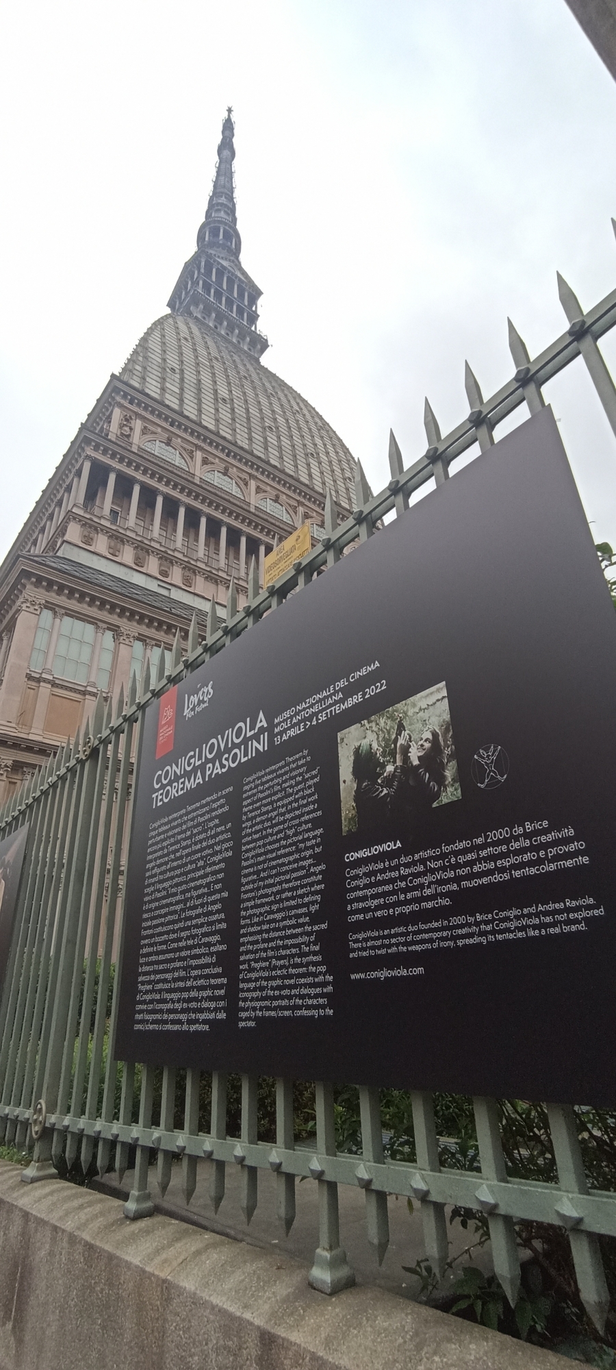 Il Museo Nazionale del Cinema ricorda Pier Paolo Pasolini, nel centesimo anniversario dalla sua nascita, con il progetto artistico ConiglioViola Teorema Pasolini, realizzato dal duo artistico ConiglioViola e ospitato dal 13 aprile al 4 settembre 2022 sulla cancellata esterna della Mole Antonelliana: un tributo a Pasolini che al tempo stesso vuole svelare un’inedita lettura del suo cinema che ancora oggi offre nuove e inaspettate chiavi interpretative.